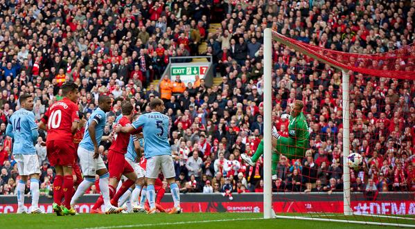 Coutinho’s corner kick found Gerrard, who was unmarked. The LFC captain headed powerfully on goal, but Hart parried it over the crossbar.