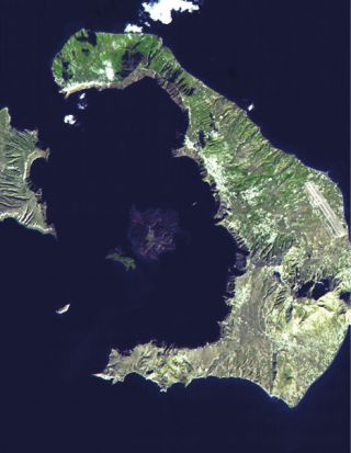 A satellite view of Santorini showing the ‘Nea Kameni’ volcano rising from the middle of the island.
