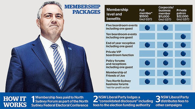 The donors are members of the North Sydney Forum, a campaign fundraising body run by Mr Hockey’s North Sydney Federal Electoral Conference (FEC). In return for annual fees of up to $22,000, members are rewarded with “VIP” meetings with Mr Hockey, often in private boardrooms.