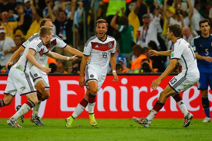 Photo: That winning moment … Germany’s Mario Goetze (C) celebrates scoring the winner against Argentina. (Reuters: Kai Pfaffenbach)