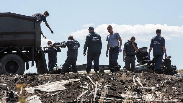 Workers from the Ukranian Emergencies Ministry transfer the bodies of MH17 victims on to a truck on Monday. Photo: Getty Images