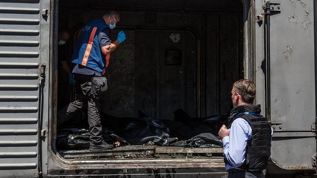 Dutch forensic experts inspect the bodies of MH17 victims stored on a train in Ukraine. Photo: Getty Images
