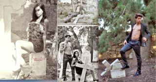 Models straddling Greek gravestones in Turkish occupied Cyprus.