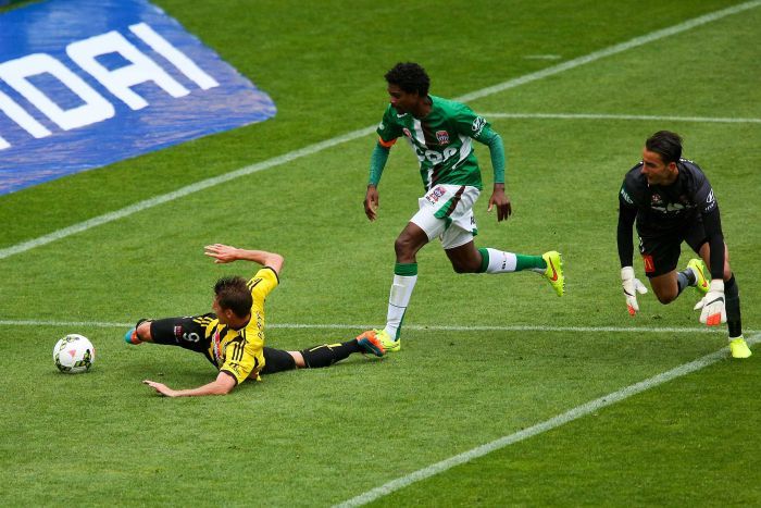 A sublime through-ball from Michael McGlinchey set Nathan Burns into a one-on-one showdown with Mark Birighitti. The Jets custodian did well to block Burns’ first effort, but as the ball squirted free, Burns crawled on all fours and somehow swung a leg at the ball, sending it trickling just over the line as Birighitti tried desperately to keep it out.