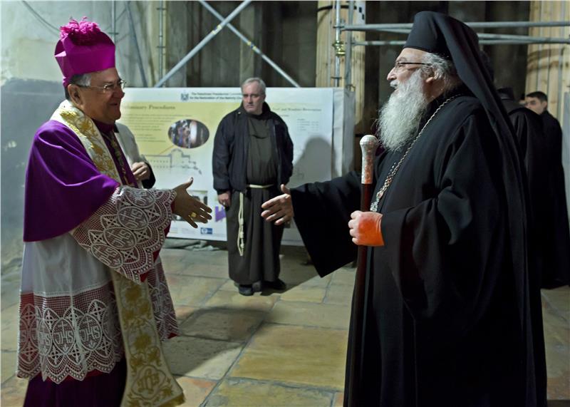 The Patriarch of the Holy Land Fouad Twal (L) reaches out to shake hands with a Greet Orthodox priest as he and the Christmas procession arrives to the Church of the Nativity, accepted by Christians as the birthplace of Jesus Christ, in the West Bank town of Bethlehem 24 December 2014. EPA/JIM HOLLANDER