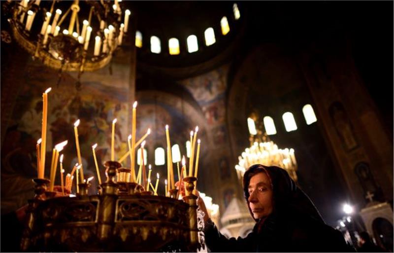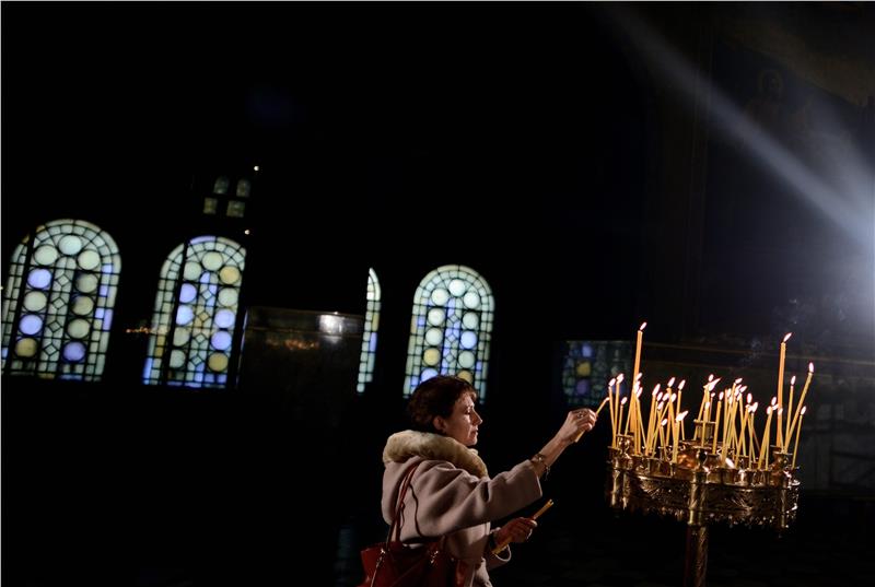A woman lights a candle during the Christmas Holy mass at the St Alexander Nevski Cathedral in Sofia, Bulgaria on Chirstmas Day, 25 December 2014. EPA/VASSIL DONEV