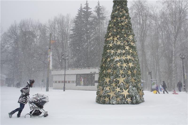 A woman walks with her child through heavy snowfall at a park in Moscow, Russia, Thursday, Dec. 25, 2014. (AP Photo/Ivan Sekretarev)