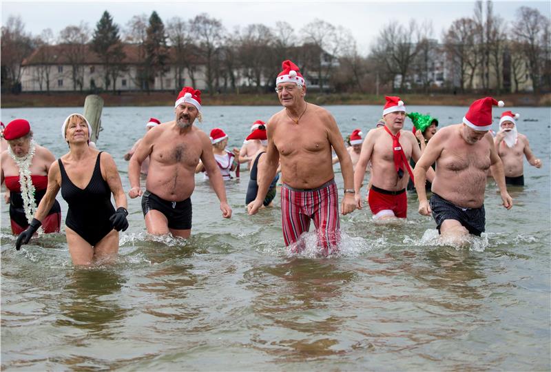 Members of the ‘Berlin Seals’ swimming club with Santa hats wade in the waters of the Orankesee lake in Berlin, during the traditional Christmas swim on Christmas Day, 25 December 2014. EPA/TIM BRAKEMEIER