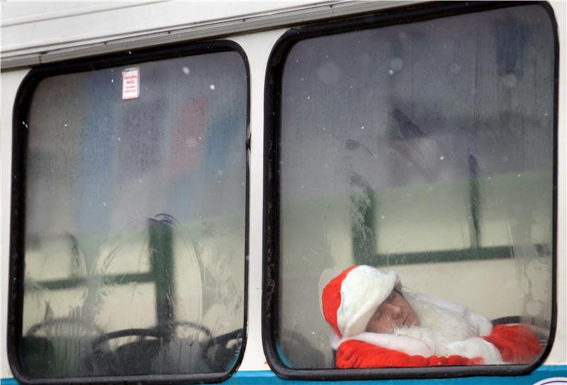 A man wearing a Ded Moroz (Grandfather Frost) costume sleeps in a bus before a Christmas parade in the center of Minsk, Belarus, 25 December 2014. More than 500 artists participated in the parade, local media report. EPA/TATYANA ZENKOVICH
