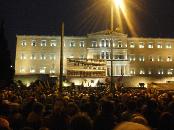 «Οι πολίτες της Αθήνας και δεκάδων άλλων πόλεων της Ελλάδας και της Ευρώπης δίνουν και πάλι ζωή στις πλατείες σε διαδηλώσεις ενάντια στη λιτότητα. Το τσουχτερό κρύο και το χιόνι δεν στάθηκαν εμπόδιο στο να γεννηθεί ένα νέο “κίνημα πλατειών” προκειμένου να συμπαρασταθεί στην προσπάθεια της ελληνικής κυβέρνησης ενάντια στην φτώχεια και την ανεργία. Στο Eurogroup και τη Σύνοδο Κορυφής δεν διαπραγματεύεται μόνη της η ελληνική κυβέρνηση αλλά μαζί με τα 10.000.000 των Ελλήνων πολιτών. Η ελπίδα έδιωξε τον φόβο».