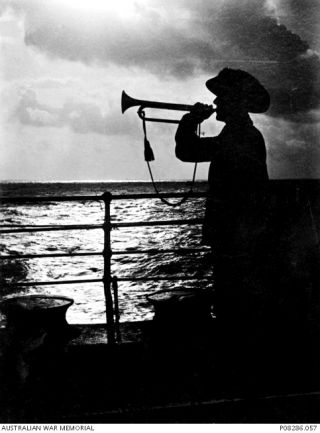 The Last Post at sunset aboard the troopship HMAT Euripides (A14). Photo: Merchant seaman engineer Denver Wood Wansey. AWM.