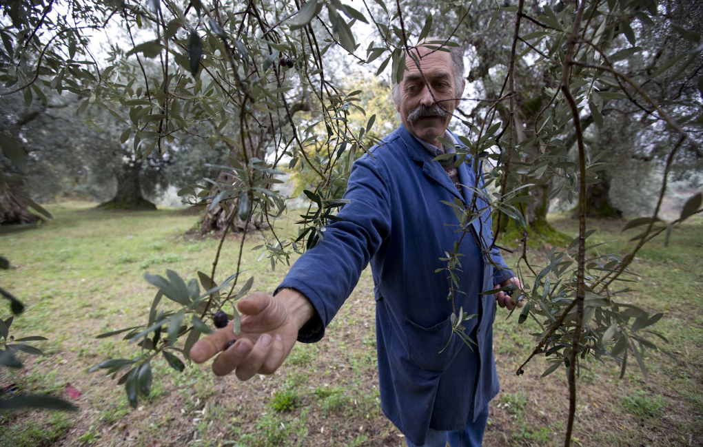Italian oil producer Augusto Spagnoli picks an olive last year. Italy’s 2014 olive harvest was declared the worst in its history, due to..