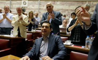 Prime Minister Alexis Tsipras being applauded by SYRIZA MPs in the Greek Parliament earlier this month. PHOTO: AP/THANASSIS STAVRAKIS.