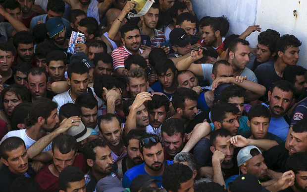 The refugees, many of them Syrians and Afghans fleeing war in their home countries, were herded into an old football stadium as the authorities attempted to register them and issue official travel documents which will enable them to take ferries to the mainland and from there head to other parts of Europe.