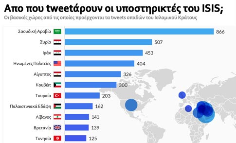 Από την Σαουδική Αραβία βρέθηκαν να προέρχονται 866 προφίλ χρηστών του twitter, κι άλλα 507 από τη Συρία, ενώ έκπληξη προκαλεί η ύπαρξη των ΗΠΑ στην τέταρτη θέση προέλευσης tweet από υποστηρικτές του ISIS.