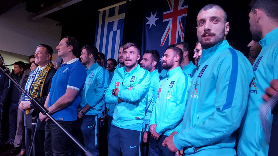 Εκατοντάδες άτομα κατέκλυσαν την αίθουσα εκδηλώσεων του Ελληνικού Κέντρου για να καλωσορίσουν τα μέλη της Ελληνική αντιπροσωπείας ενόψει του σημερινού φιλικού αγώνα με την Εθνική Αυστραλίας στο στάδιο «Ετιχαντ».