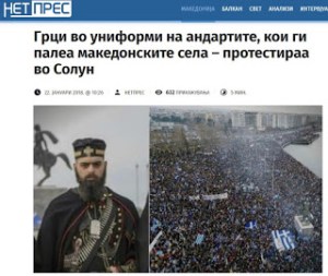 Οι Έλληνες με στολές ανταρτών (Μακεδονομάχων) του 19ου αιώνα, που έκαψαν τα «μακεδονικά» χωριά στη «Μακεδονία του Αιγαίου», που έσφαξαν και εκδίωξαν «Μακεδόνες» (Βουλγάρους), χθες στο κέντρο της Θεσσαλονίκης ζήτησαν τη διαγραφή της (Ψευδο)«Μακεδονίας», γράφει το σλαβικό κείμενο και συνεχίζει: