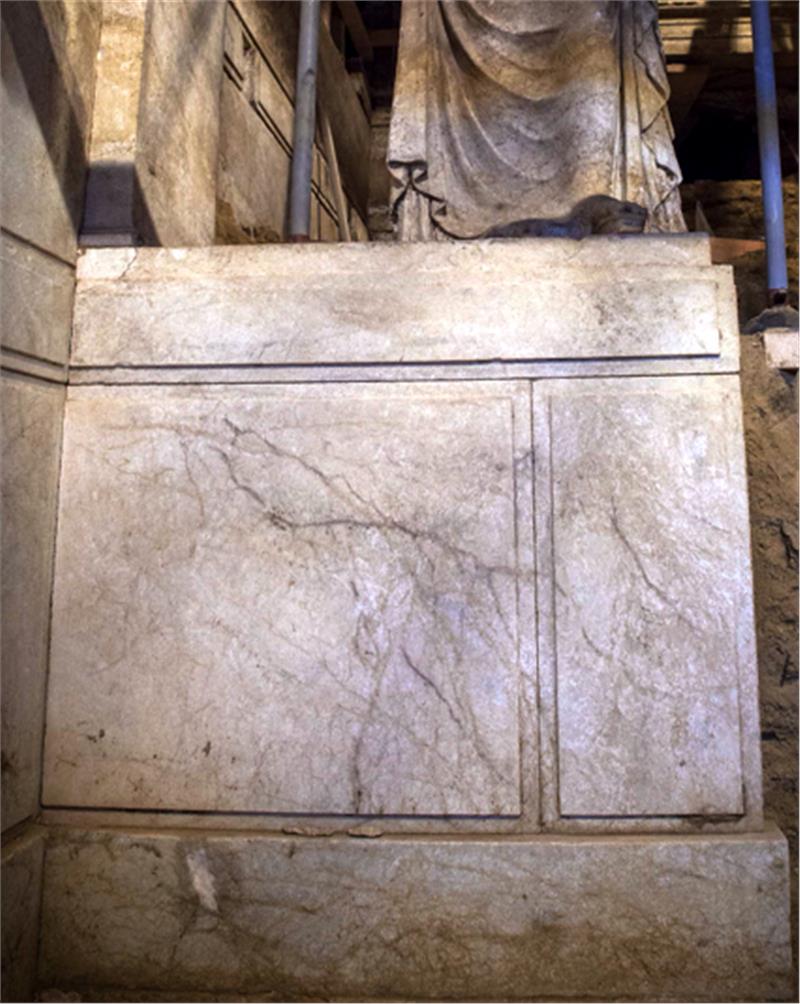Κατά την ανασκαφή αποκαλύφθηκε η συνέχεια των πλευρικών τοιχωμάτων, η οποία δεν διαφέρει καθόλου από τους προηγούμενους χώρους, ήτοι ορθομαρμάρωση, όμοια με εκείνη που υπάρχει σε όλους τους χώρους του μνημείου.