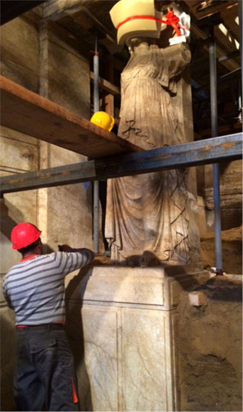 – Να σημειώσω ότι στον χώρο, δηλαδή, πίσω από τις Καρυάτιδες ως τον τρίτο διαφραγματικό τοίχο, τοποθετήθηκε η δεύτερη φάση αντιστήριξης, με ισχυρές μεταλλικές κοιλοδοκούς.